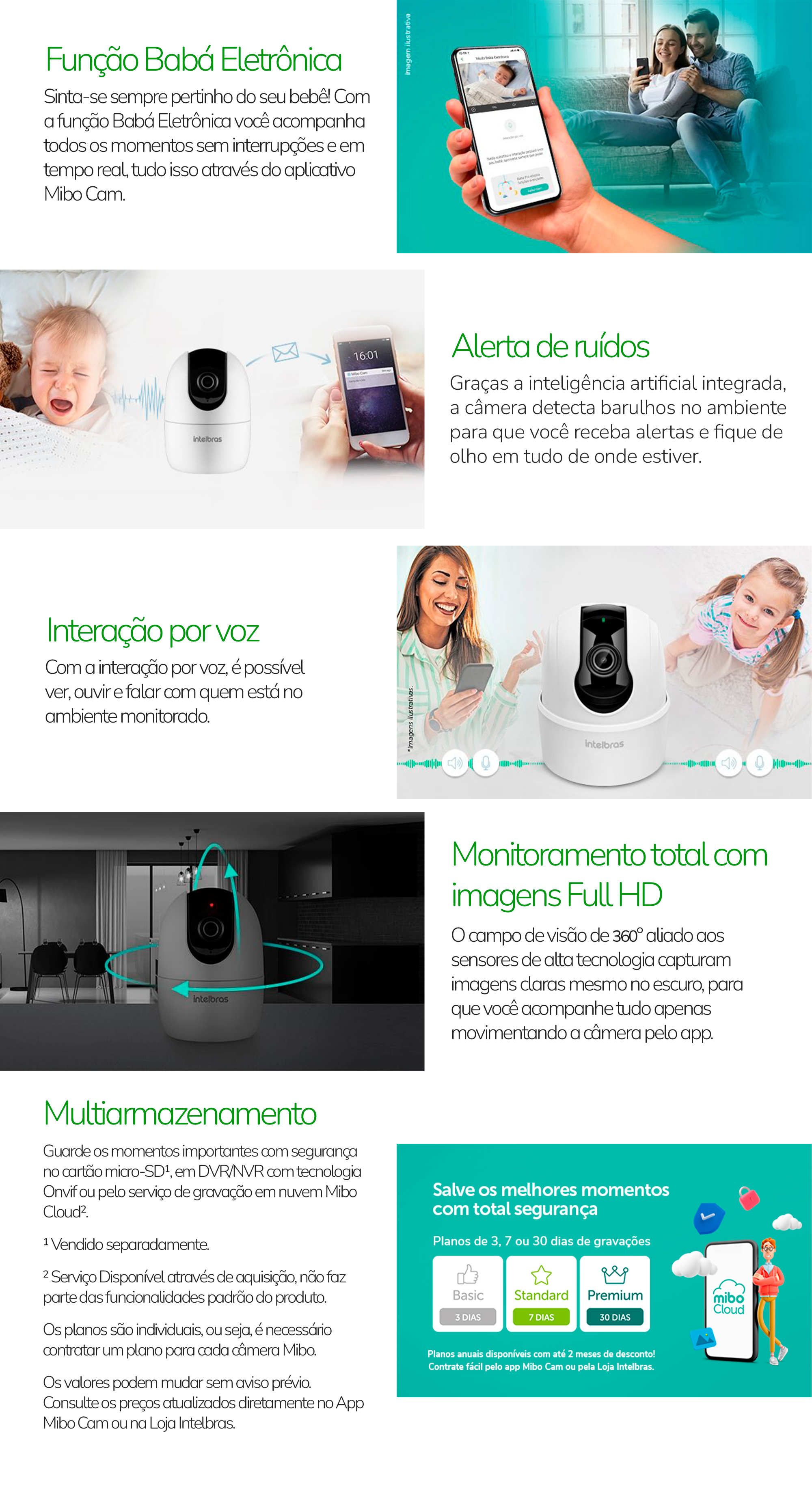 O campo de visão de 360 aliado aos sensores de alta tecnologia capturam imagens claras mesmo no escuro, para que você acompanhe tudo apenas movimentando a câmera pelo app. Ângulo de visão diagonal de 115, rotação horizontal de 355 e rotação vertical de 85.