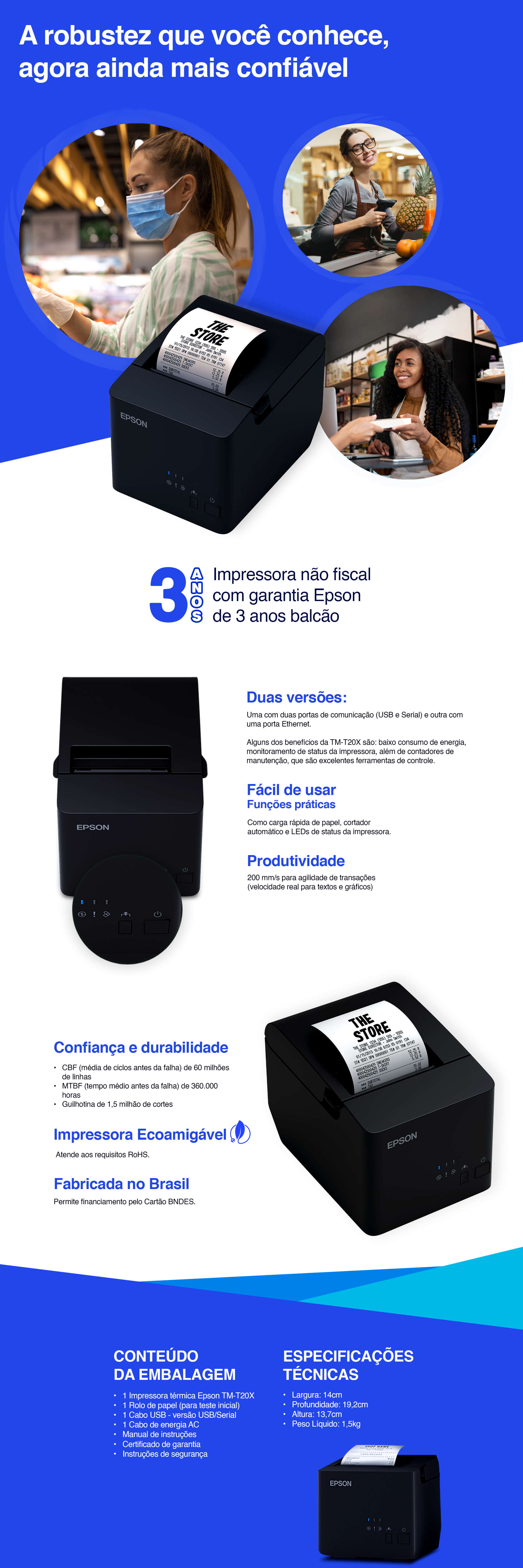A econômica impressora térmica TM-T20X da Epson é versátil, possui alta confiabilidade e funções fáceis de usar, como carga rápida de papel (drop-in), guilhotina inclusa e muito mais.